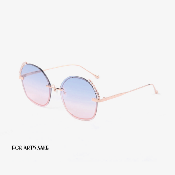 Moderne dhe elegante janë syzet e diellit nga marka For Art’s Sake të cilat janë me formë rrumbullake me ngjyrë të kaltër dhe rozë, si dhe janë dekoruar me kristale të pastra. Syzet janë punuar nga metali dhe janë shumë cilësore.